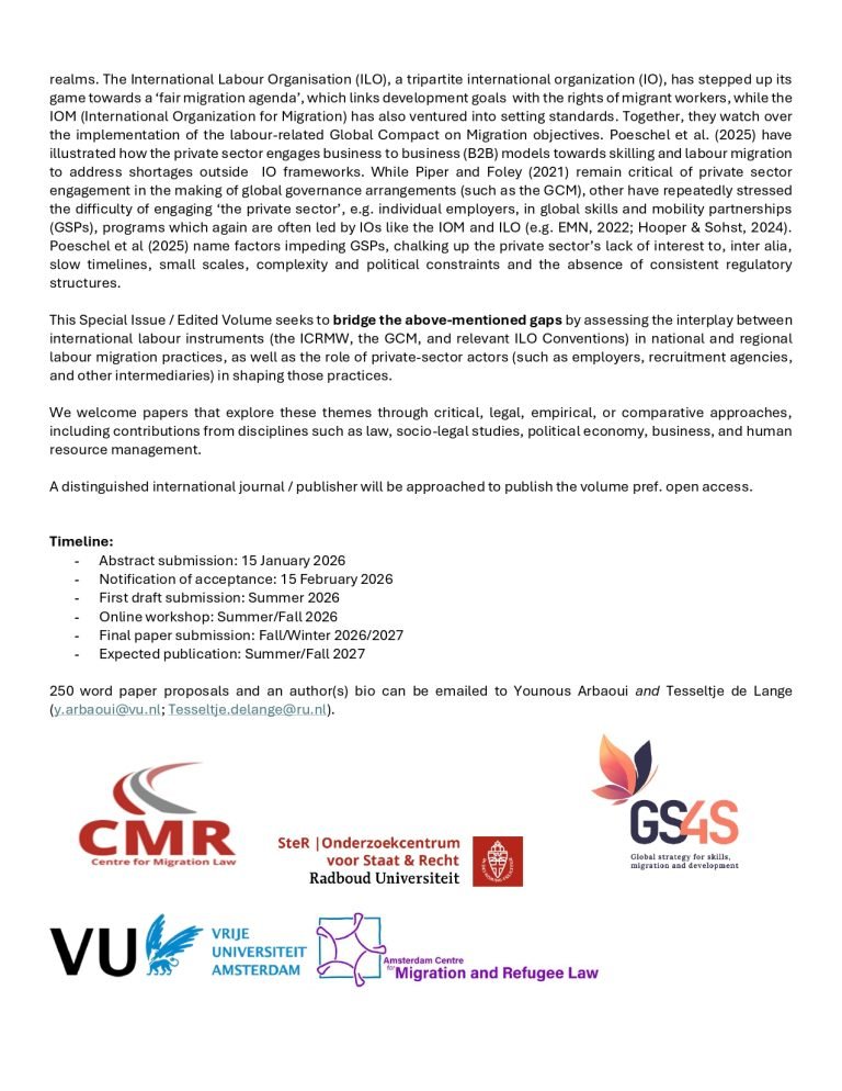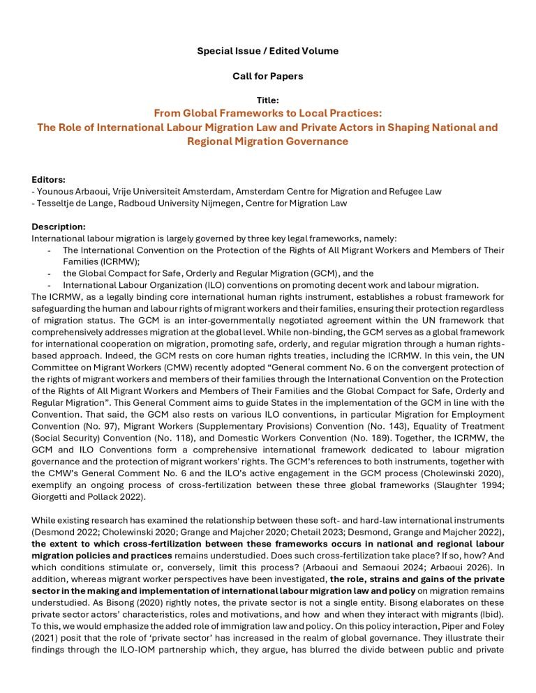 Our member, Professor Tesseltje de Lange, Professor of European Migration Law and Director at Centre for Migration Law (CMR), Radboud University Nijmegen, with Professor Younous Arbaoui (Vrije Universiteit Amsterdam) annunce a call for papers titled “From Global Frameworks to Local Practices: The Role of International Labour Migration Law and Private Actors in Shaping National and Regional Migration Governance.”