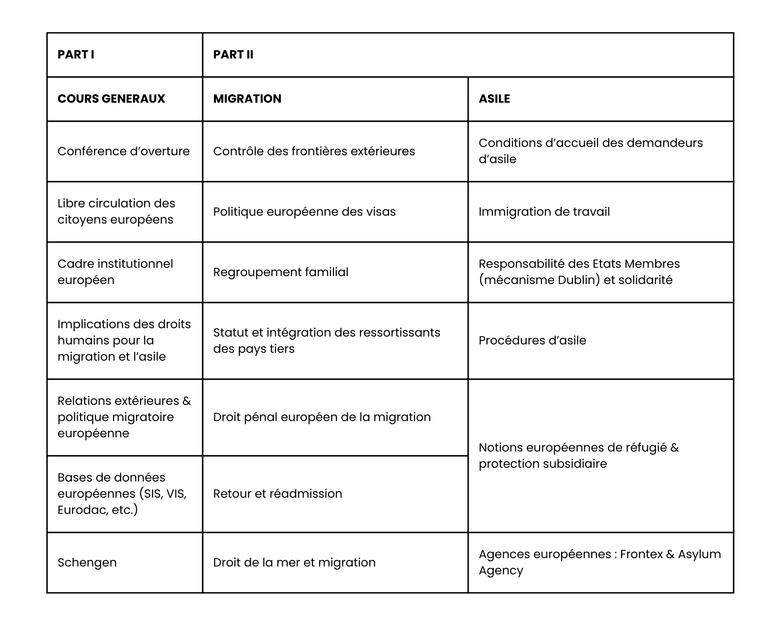 Cette 25e édition du cours d’été couvre les nouveaux instruments récemment adoptés dans le cadre du nouveau pacte sur la migration et l’asile. Tous les cours sont entièrement mis à jour et couvriront le filtrage des migrants, les mécanismes de solidarité et de responsabilité entre les Etats membres, les procédures d’asile aux frontières, Eurodac, le règlement crise, force majeure et instrumentalisation, les conditions d’accueil des demandeurs d’asile, l’éligibilité des personnes sollicitant la protection internationale ainsi que le rôle de l’agence asile de l’UE. La question de la politique de retour qui figurera au coeur de l’actualité européenne sera également couverte avec, outre le cours dédié, un débat sur la proposition législative de la Commission européenne.