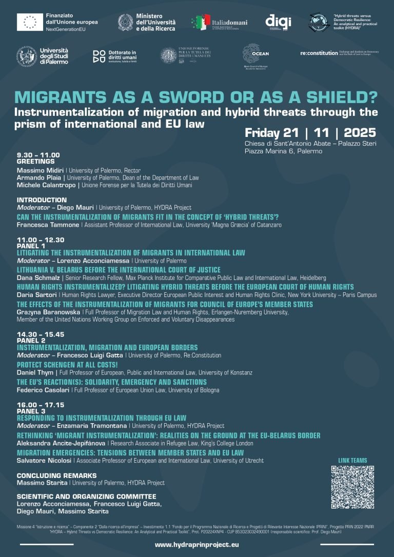 Our member Daniel Thym, Full Professor of Public, European, and International Law and as the Director of the Research Centre Immigration & Asylum Law (FZAA) at the University of Konstanz, will be speaking during the third panel of the Conference “MIGRANTS AS A SWORD OR AS A SHIELD? Instrumentalization of migration and hybrid threats through the prism of international and EU law” hosted by the University of Palermo.