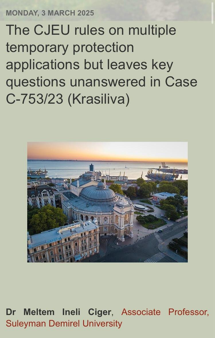 Dr. Meltem İneli Ciğer, member of the Odysseus Network for Turkey and Associate Professor at the Suleyman Demirel University, published the blog post “The CJEU rules on multiple temporary protection applications but leaves key questions unanswered in Case C-753/23 (Krasiliva)”.